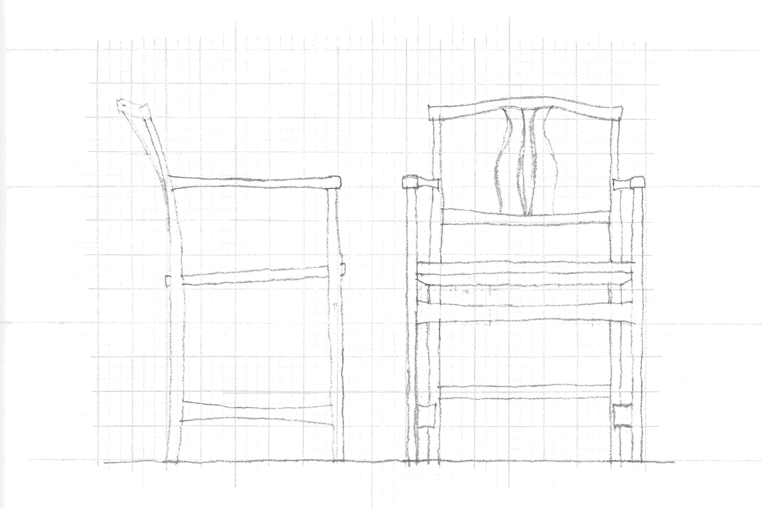 As I began sketching my second project in the chair making journey, I realized that in order to get a good handle on proportion, I needed to make use of my new familiarity with Vidar's Chair. I studied this by translating the physical chair back into drawing form. Above you see a small-scale sketched version of Vidar's Chair. I used that as a foundation to work from.