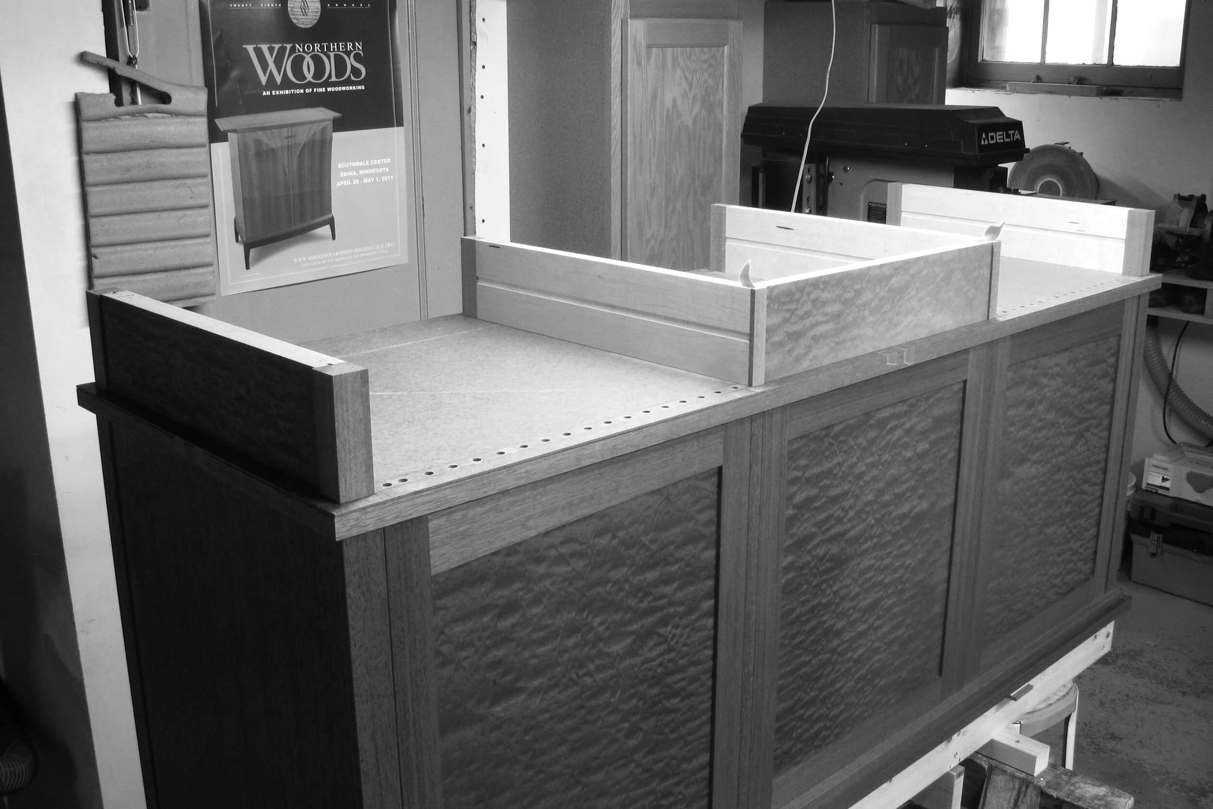The top veneers are ready for the vacuum bag, as well as a maple bottom veneer for the drawer pocket interior.