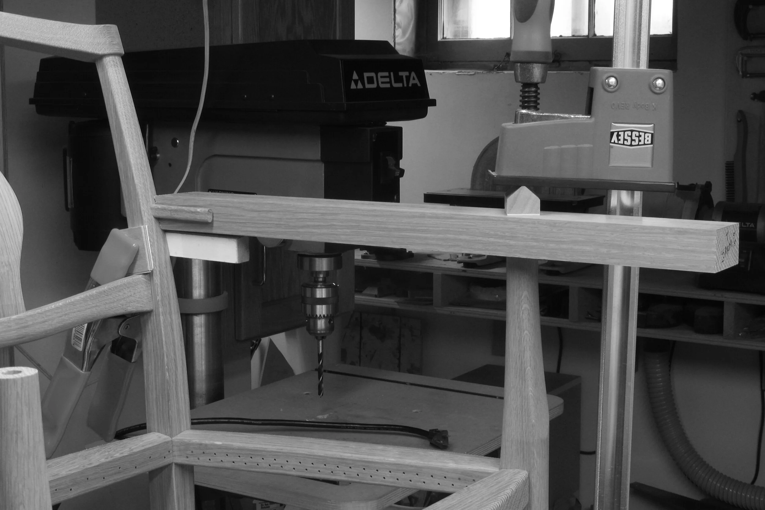 Having achieved a good fit, I then located and bored the dowel pin holes on the underside of the front end of the arms. Now the templates are pulled out and traced onto the arms.