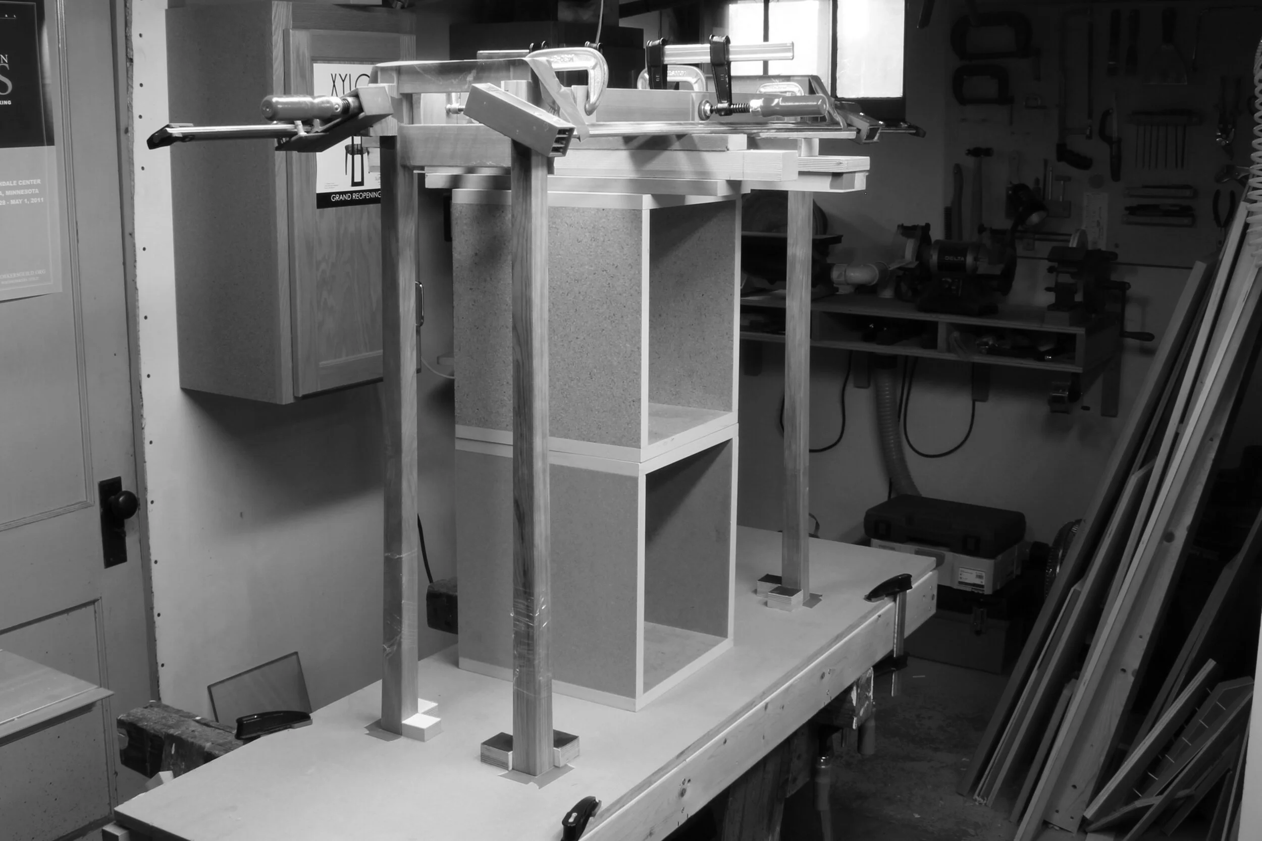 I glued up the four joints in two stages; both on the same day. The set-up for gluing and clamping is shown below. With relatively light force used with the clamps, I added the temporary scaffolding to support the weight of the clamps so that they didn't fall off during the night and damage the piece.