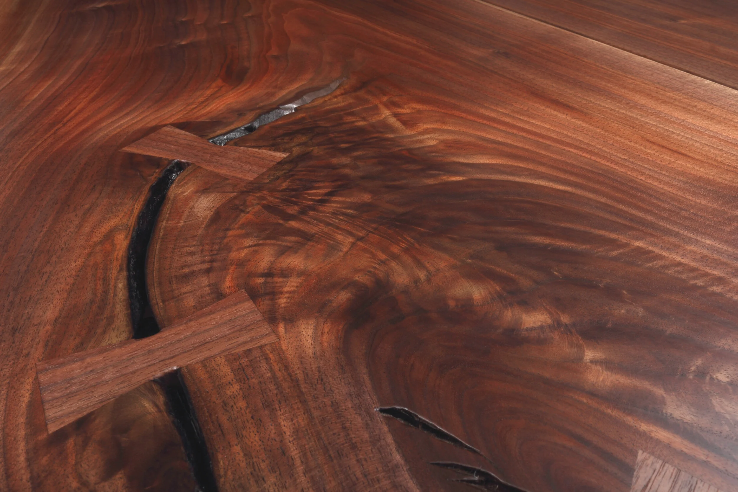 This commissioned piece arose out of the client's desire for a desk made by a local artisan, an appreciation for the natural-edge work of George Nakashima, and the flexibility to take the idea in a slightly different direction. All the wood for this piece came from a single Nebraska tree which had likely been planted as part of the "Shelterbelt Project" by Works Progress Administration or Civilian Conservation Corps workers during the Great Depression of the 1930s. This quest to control the drought-stricken prairie exemplified our ongoing struggle to find a balance between allowing nature to be what it is, and controlling it to suit our needs.