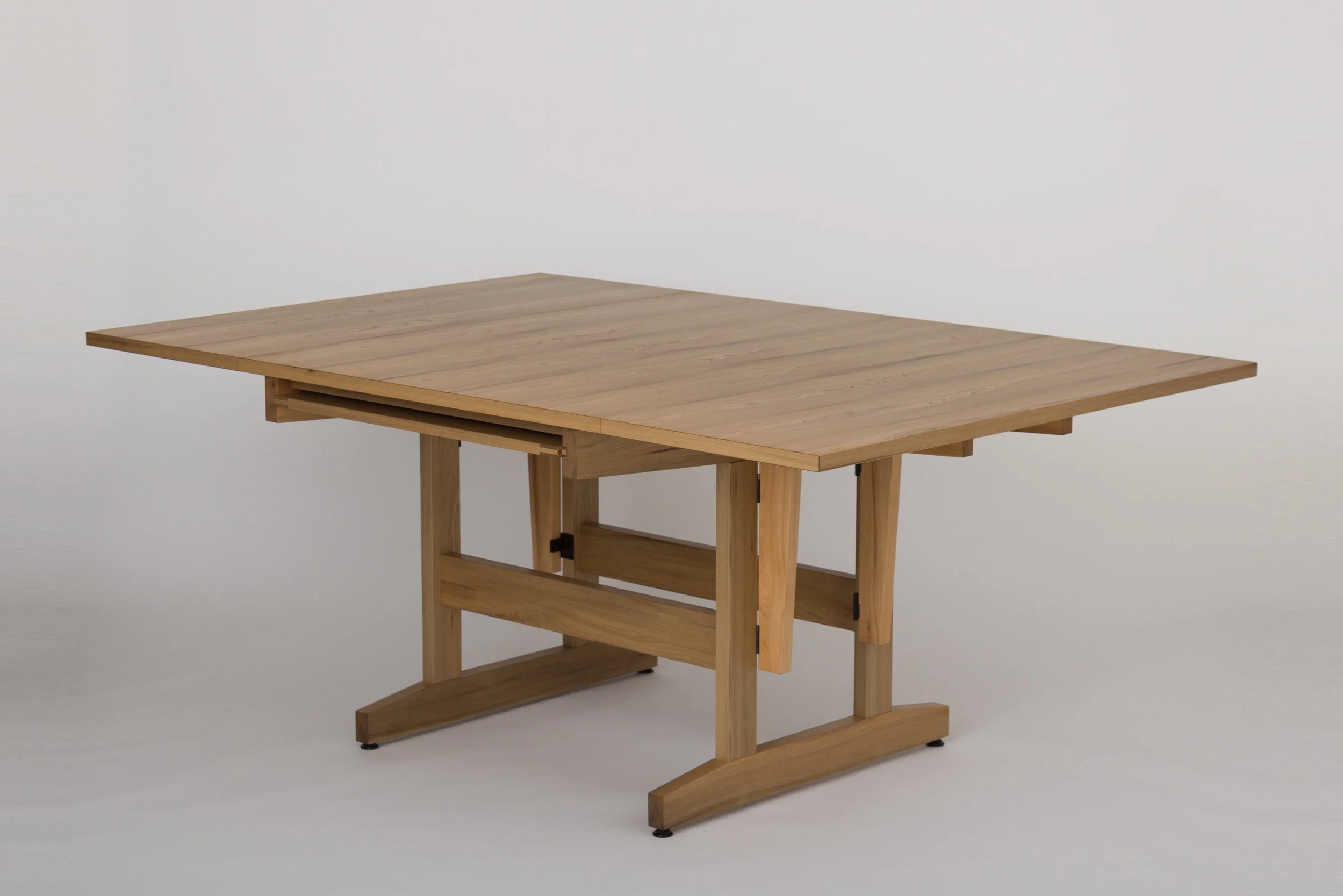 Appearing in the client’s online search for a custom furniture maker, I was asked to make a game table. 3’-0” x 4’-0” main tabletop with two 1’-6” x 4’-0” drop leaves. Also, two 12” x 24” sliding shelves on the two open ends of the table. Clean simple lines; no extraneous detail. Wood: darker rather than lighter.